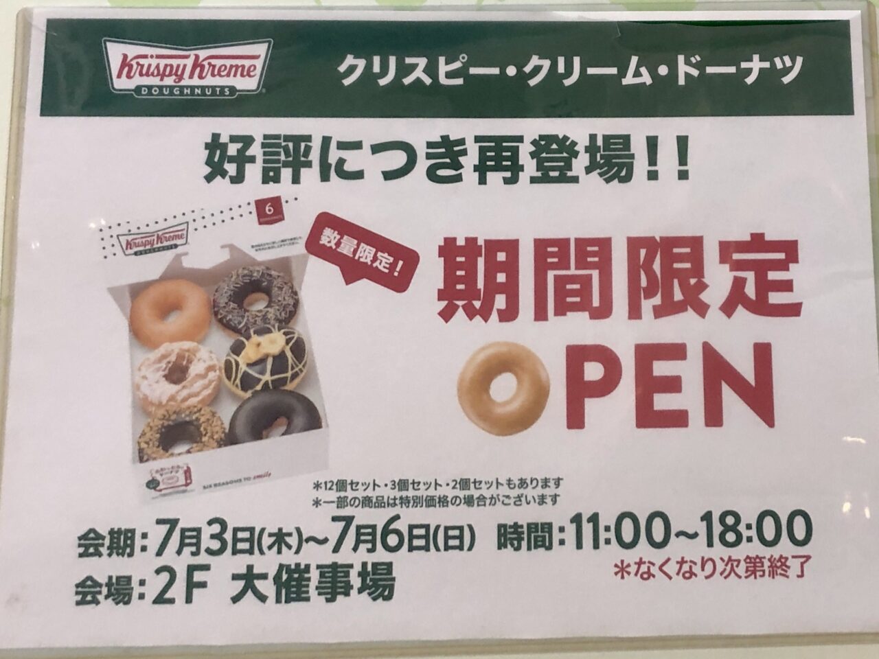 「クリスピー・クリーム・ドーナツ」は、2F大催事場にて期間限定オープン。期間は2025年7月3日(木)から6日(日)までで、11時から18時まで販売されます(なくなり次第終了)。また、6月18日(水)より、便利な「お取り置き予約サイト」も予約可能だそうです。並ばず受け取れるのはとても便利ですね。