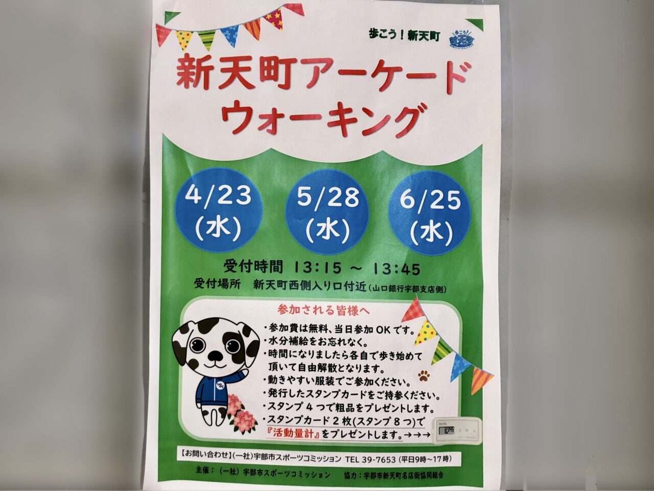 6月25日(水)開催の「新天町アーケードウォーキング」では、新天町の中を楽しくウォーキングするイベント。受付時間は13時15分から13時45分までの30分間で、受付場所は新天町西側入り口付近(山口銀行宇部支店側)となっています。