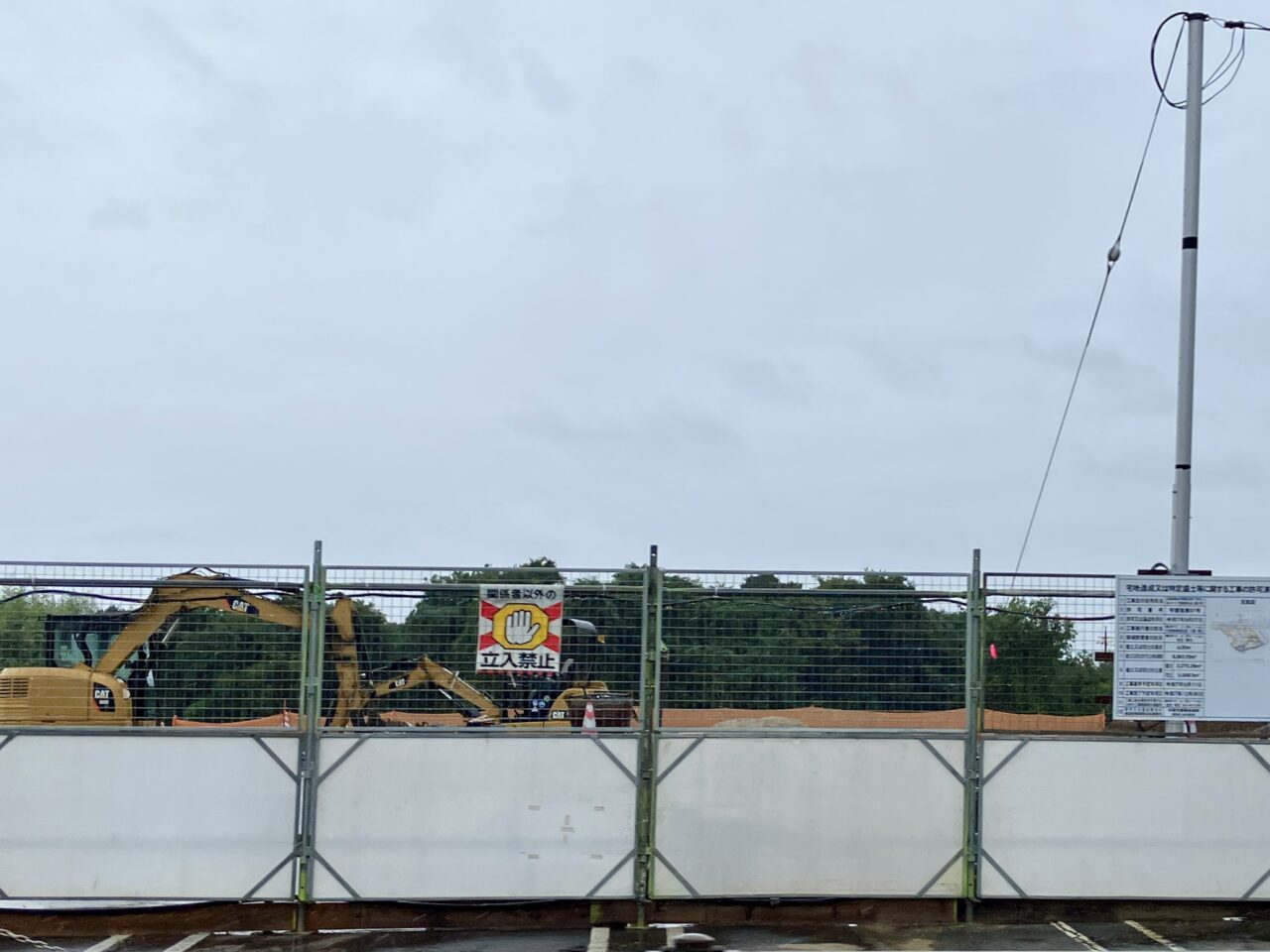8月11日(月・祝)に訪れてみると、前回訪れた時と同様、敷地は仮囲いで大きく囲まれています。そして、変わらず工事車両も複数台停まっている様子。