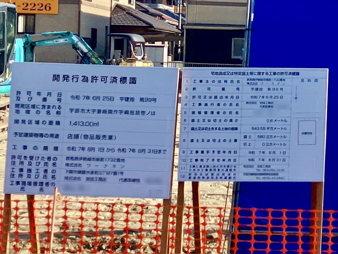 気になりつつ看板を確認してみると、そこには「開発行為許可済標識」と書かれた看板が。そして読み進めていくと、気になる文字を発見!「工事を受けた者の住所及び氏名」の項目部分には、なんと「株式会社ワークマン」と文字が…!
