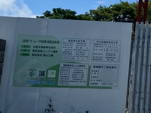 なんと、建設工事看板には「(仮称)ラ・ムー宇部東須恵店新築」との記載が。こちらで施工中のラ・ムーは「宇部東須恵店」となるのでしょうか…?これは気になりますね!