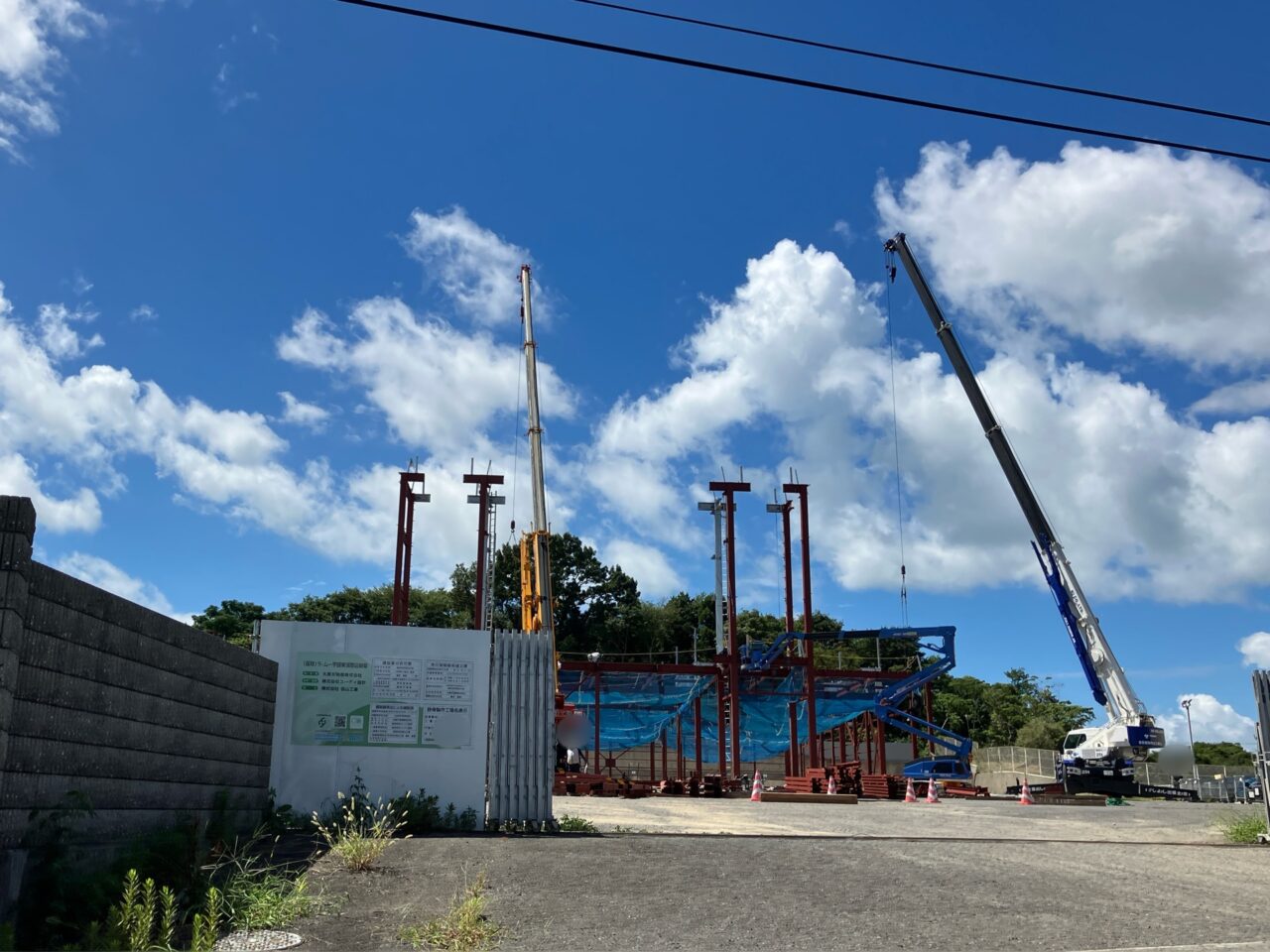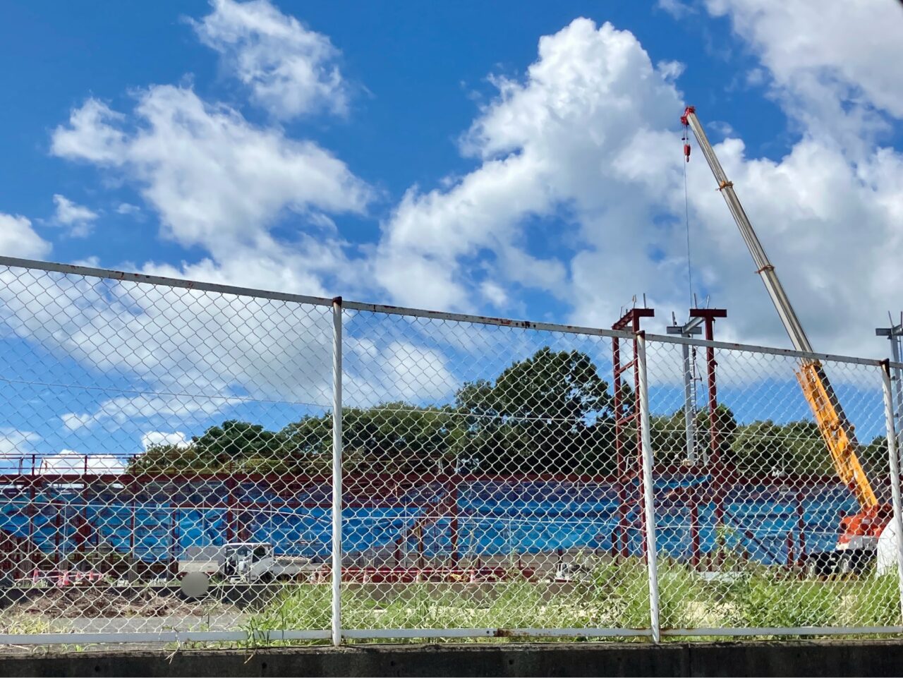 すると……、フェンス越しからも分かるほど、敷地内には大きな骨組みが見えてきます!また、クレーン車で何やら大掛かりな作業が行われているようですね。