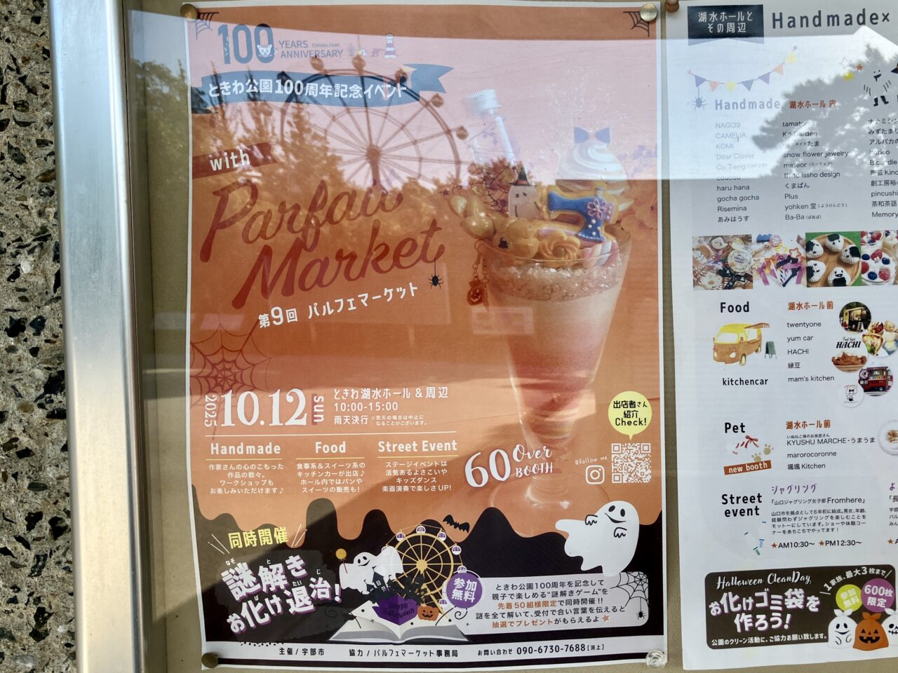 「ときわ公園開設100周年記念 パルフェマーケット」です!第9回を迎えたこちらのイベント。毎回可愛いポスターが癒されますね。開催時間は10時から15時まで。入場無料で、ときわ湖水ホールで開催するそうです。