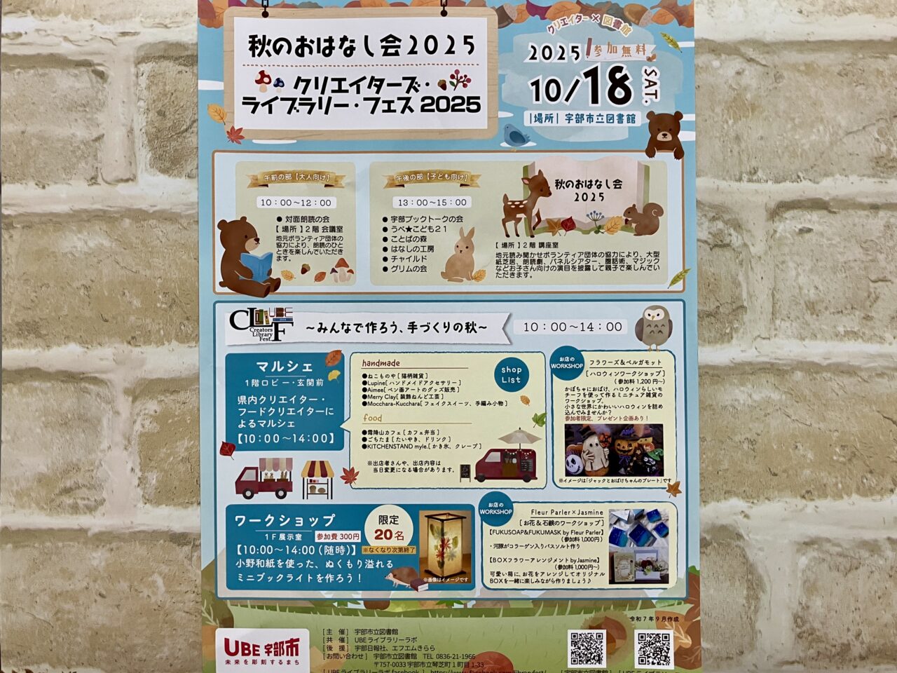 2025年10月18日(土)、宇部市琴芝町の「宇部市立図書館」では、美味しい食事と楽しいおはなしが満喫できるイベントを開催するそうです!