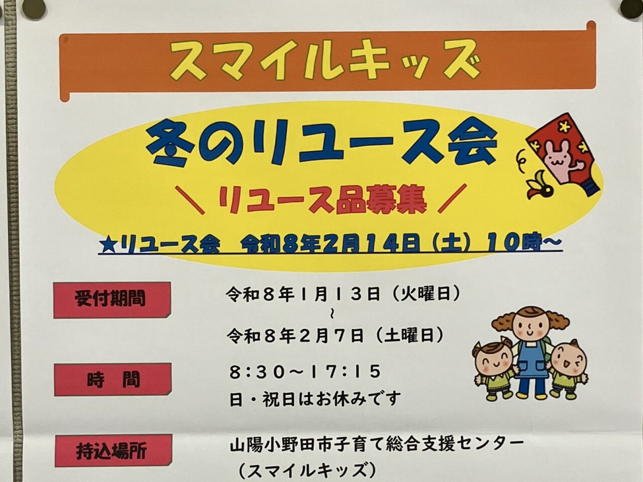 【山陽小野田市】冬のリユース会の開催に伴い、1月13日よりリユース品の募集がスタートしたそうです。