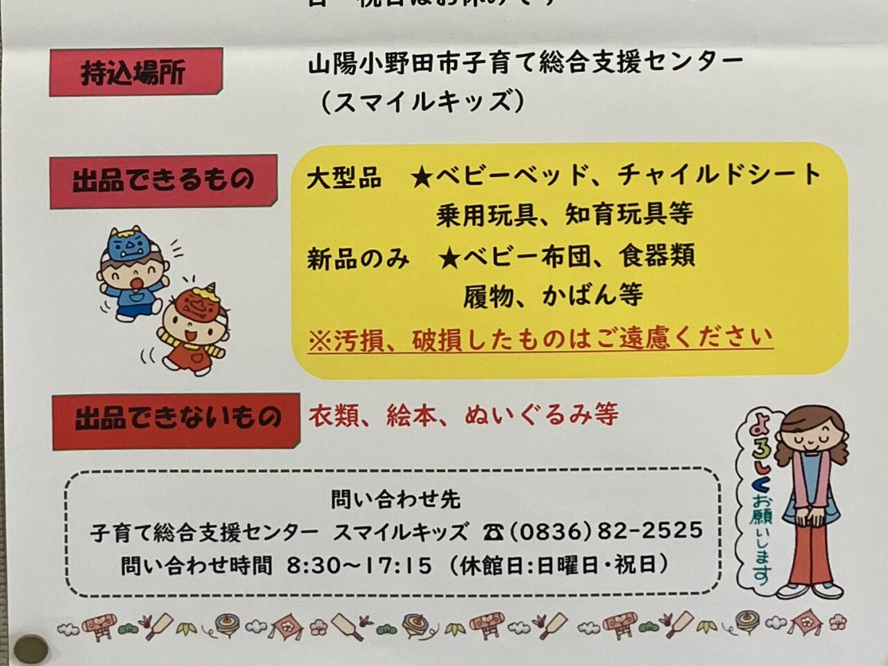 持ち込み場所は、山陽小野田市くし山にある「山陽小野田市子育て総合支援センター スマイルキッズ」です。