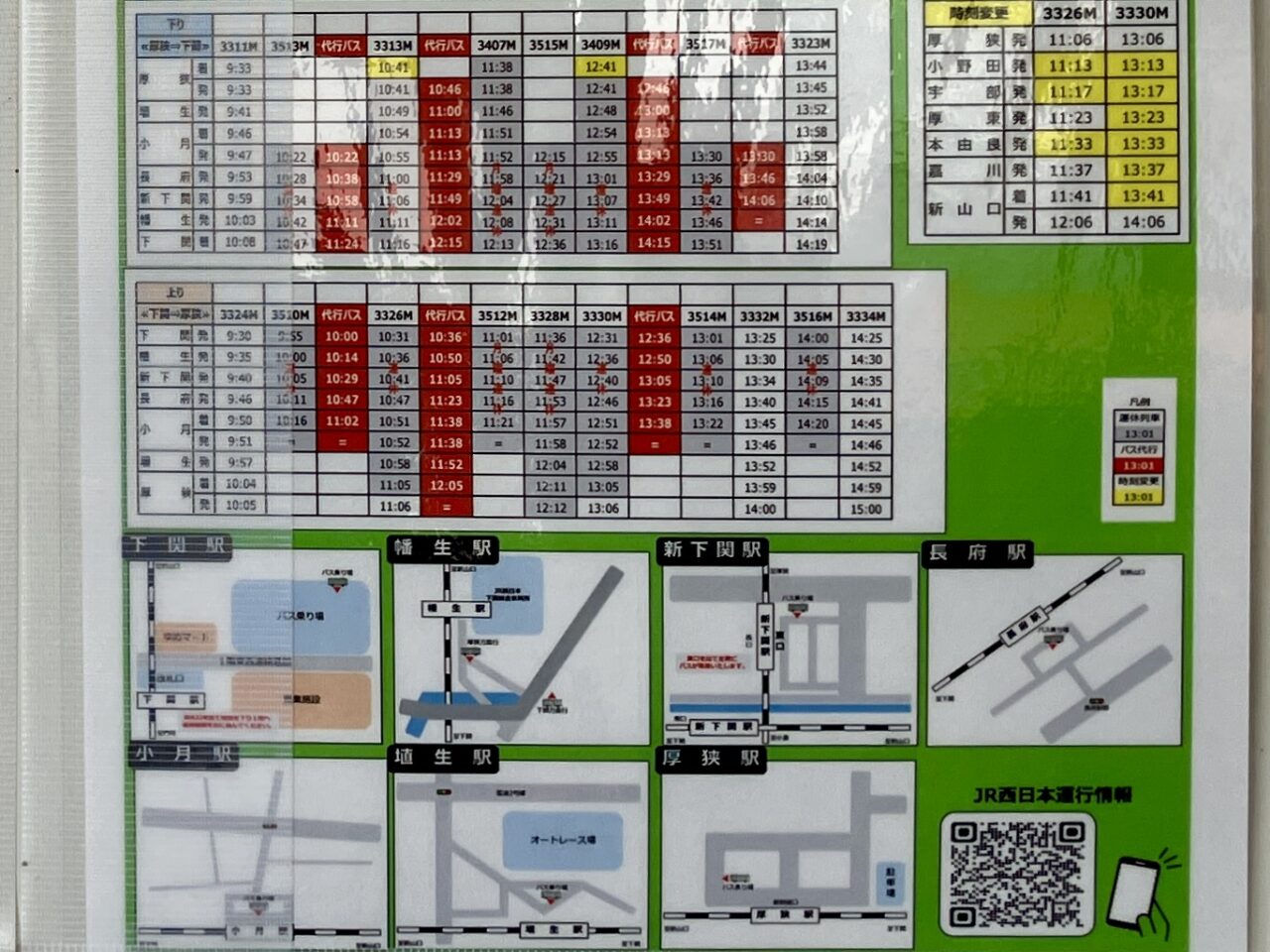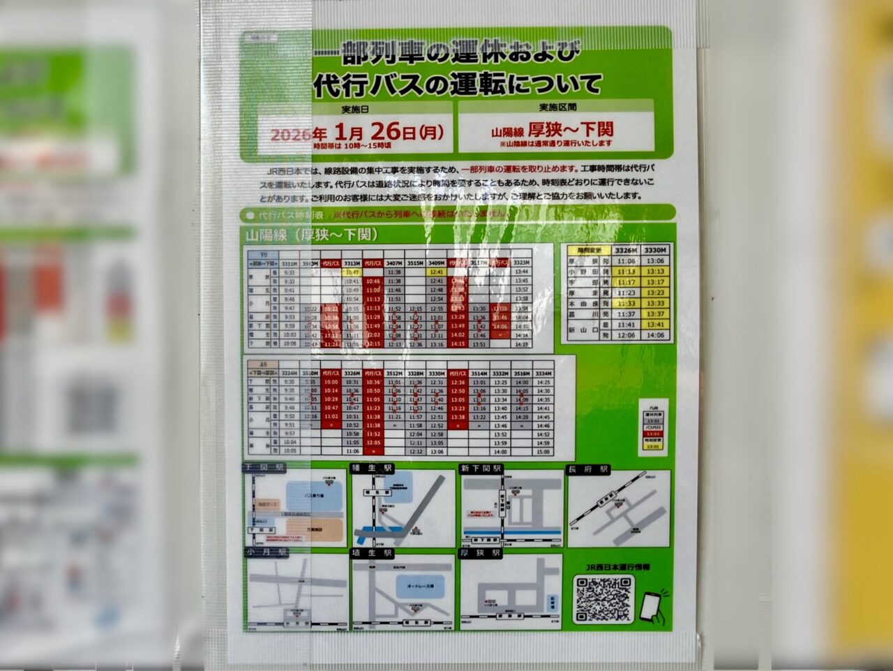 赤いラインが代行バス運行時間となっており、灰色が列車運休と表示されています。ご利用予定の方は、代行バス時刻にご注意くださいね。代行バス乗車地は、厚狭駅では「厚狭駅新幹線口」のバス乗り場となっているようです。