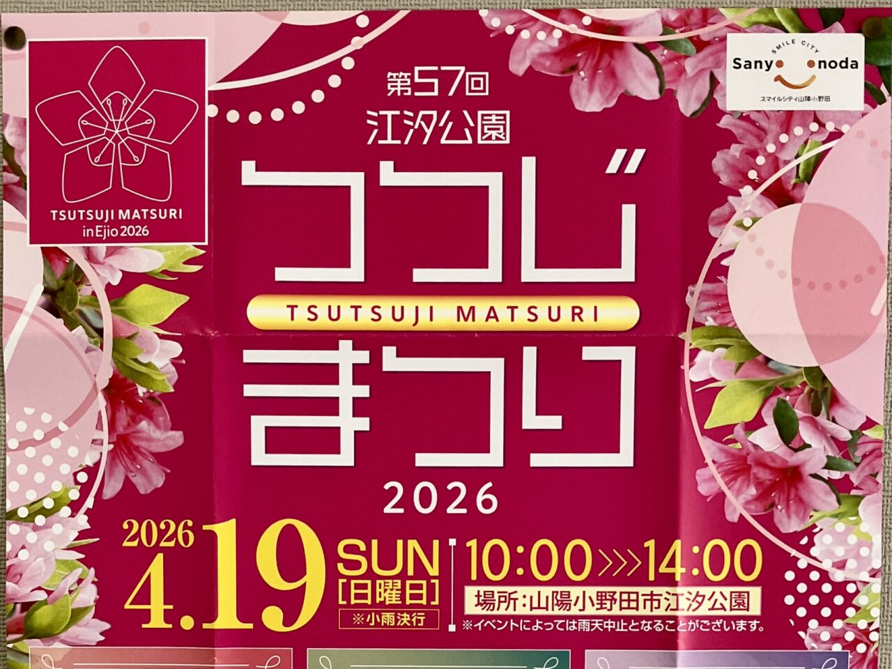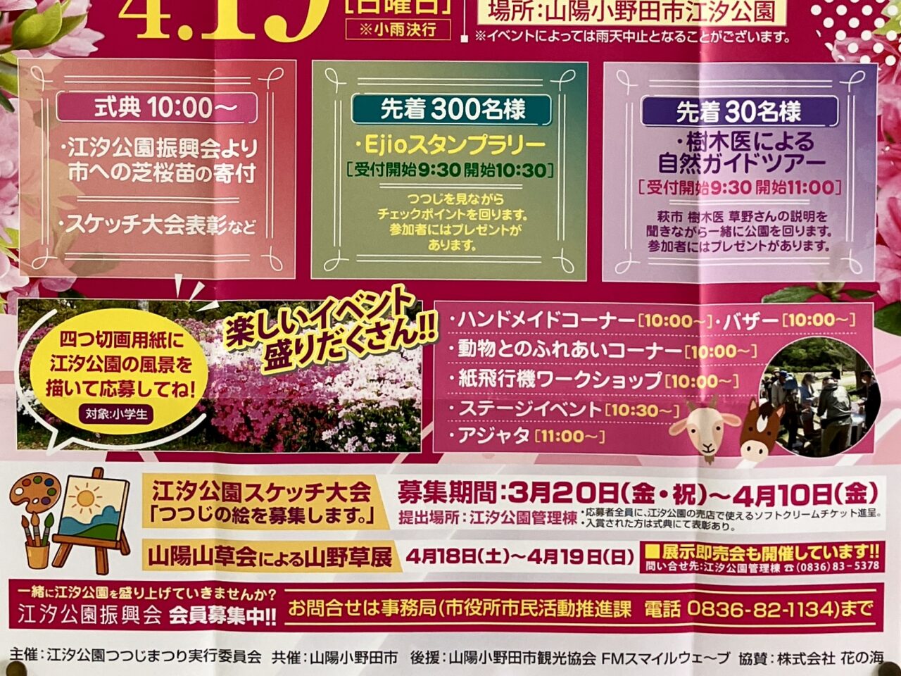 つつじをたくさん感じる明るいピンク色のお知らせには、開催日時や場所が記されていました。開催時間は10時から14時までで、山陽小野田市江汐公園で開催。また、小雨決行だそうです。