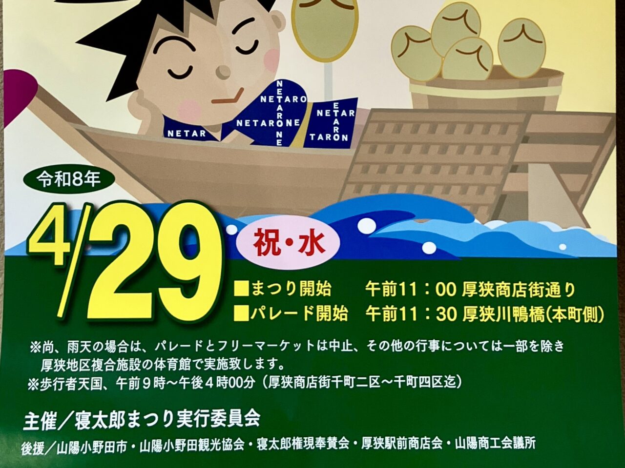 ゴールデンウィーク初日は、イベント盛りだくさんの「寝太郎まつり」で楽しい時間を過ごしてはいかがでしょうか♪また、当日は「厚狭商店街千町二区~千町四区」まで歩行者天国となります。規制時間は午前9時~午後4時までとなり、周辺道路にご注意くださいね。