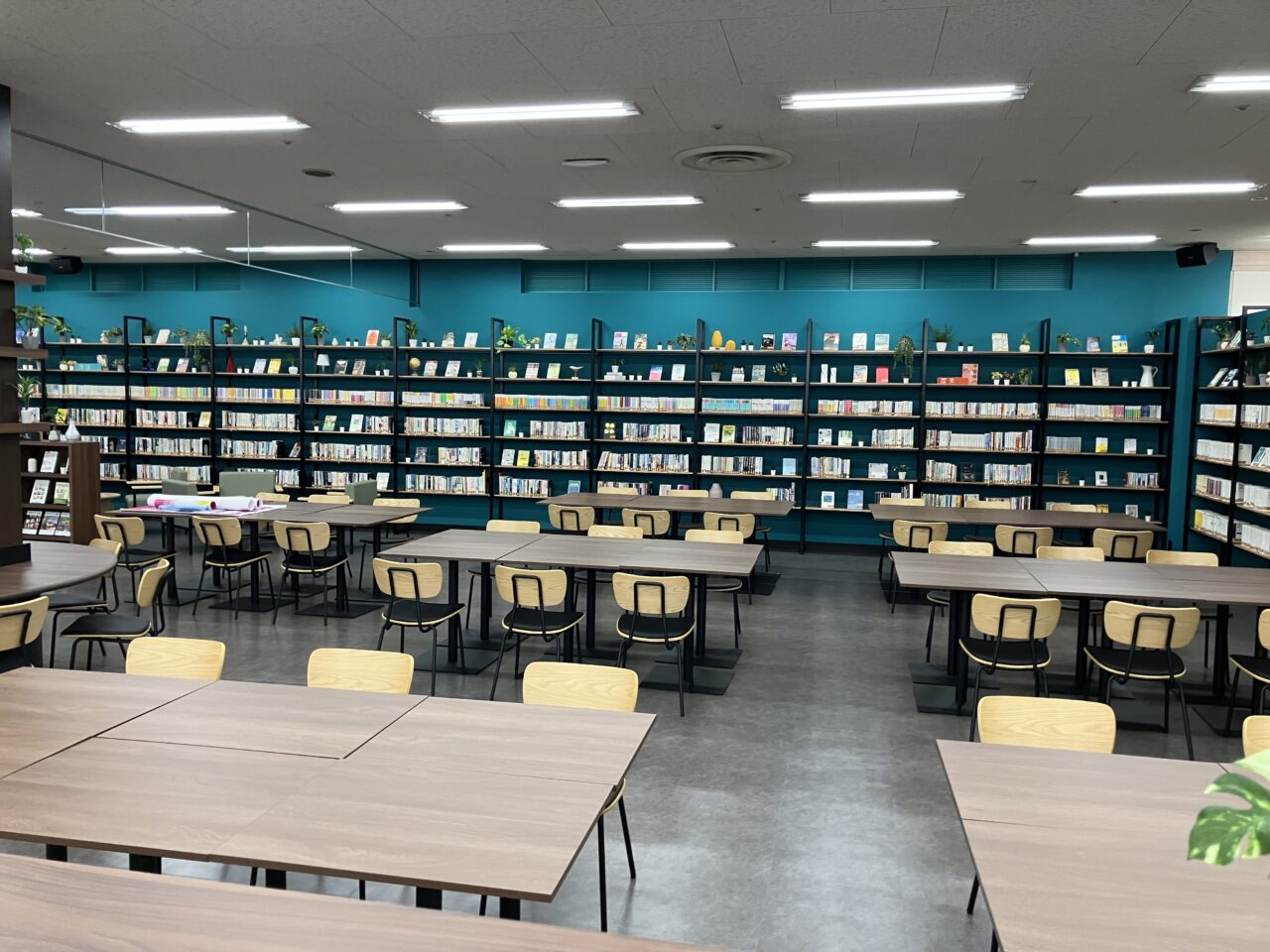 壁面にある本棚にもずらりと本が…!広さ約330平方メートルもある広い空間には、たくさんテーブルが用意され、いつでもくつろげる「憩いの場」となっています。